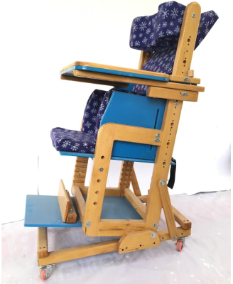 A postural supportive device that enables children with a developmental delay to assume an upright sitting position with adequate support.
